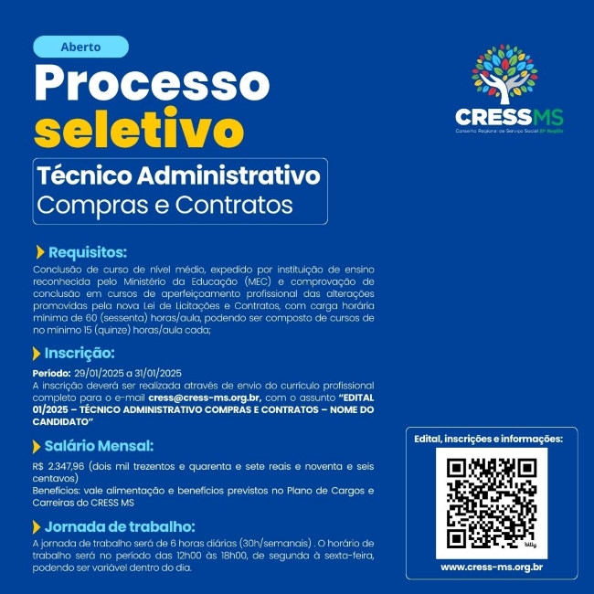 O Conselho Regional de Serviço Social – CRESS 21ª Região, localizado na Rua Dr. Arthur Jorge, nº 48, Centro, Campo Grande/MS, torna pública a realização do Processo Seletivo Simplificado Nº 01/2025, destinado à contratação de cargo temporário de Técnico Administrativo – Compras e Contratos, em conformidade com o disposto no art. 37, inciso IX, da Constituição Federal.